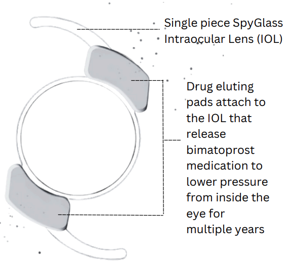 This is a single-piece lens designed for cataract surgery that includes drug-eluting pads releasing bimatoprost to lower intraocular pressure over multiple years. It is made from the same material as standard IOLs and is implanted using typical cataract surgery techniques. The bimatoprost therapy has been FDA-approved for over 20 years. The SpyGlass drug delivery system is currently limited to investigational use under U.S. law. Participants may receive reimbursement for time and travel, as well as eye exams and follow-up care for up to three years. Patients with glaucoma or ocular hypertension should inform their healthcare provider if considering cataract surgery.